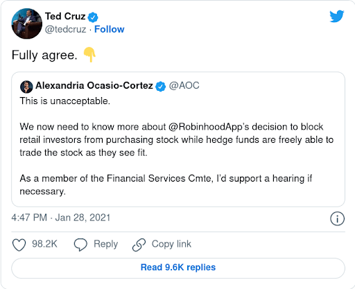 Even both extremes of the political spectrum weighed in to complain about Robinhood’s actions…
